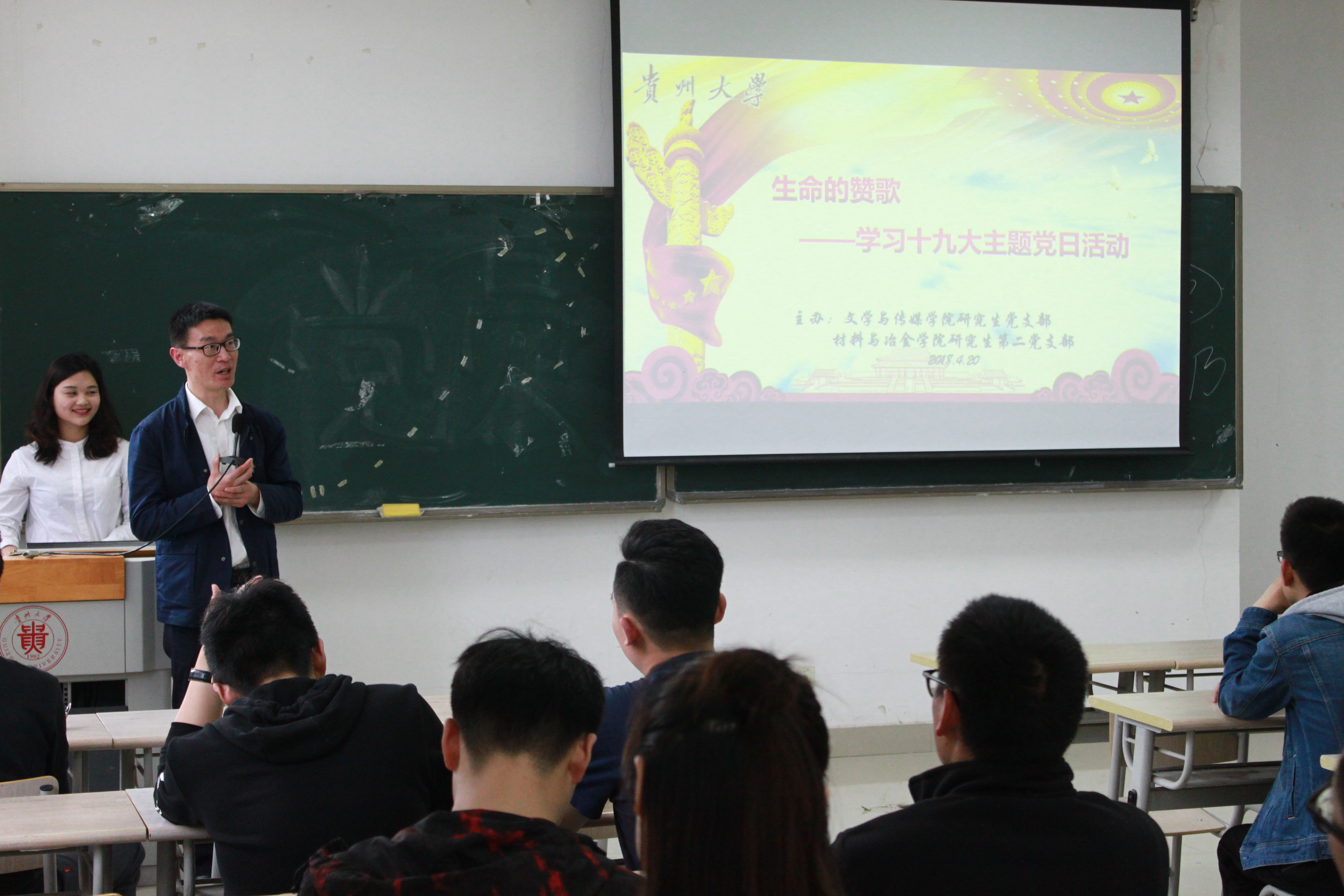 2018年4月20日下午3:00英国上市公司365研究生第二党支部与文学与传媒公司研究生党支部开展了主题为《生命的赞歌》十九大精神的学习活动。出席此次活动的有材料与冶金公司党委副书记张瑞良、文学传公司辅导员吴卿老师以及英国上市公司365及文学与传媒公司相关支部的全体研究生党员。活动开始之前张瑞良副书记对材料与冶金公司党员学习情况进行了简短介绍并且表达了对文学与传媒公司师生热烈的欢迎之情。