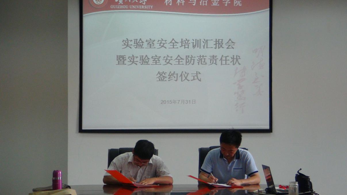 7月31日下午,公司在409会议室举行2015年实验室安全培训汇报会暨实验室安全防范责任状签约仪式。公司领导班子及全体教职工出席本次会议,书记胡环宇主持会议。
