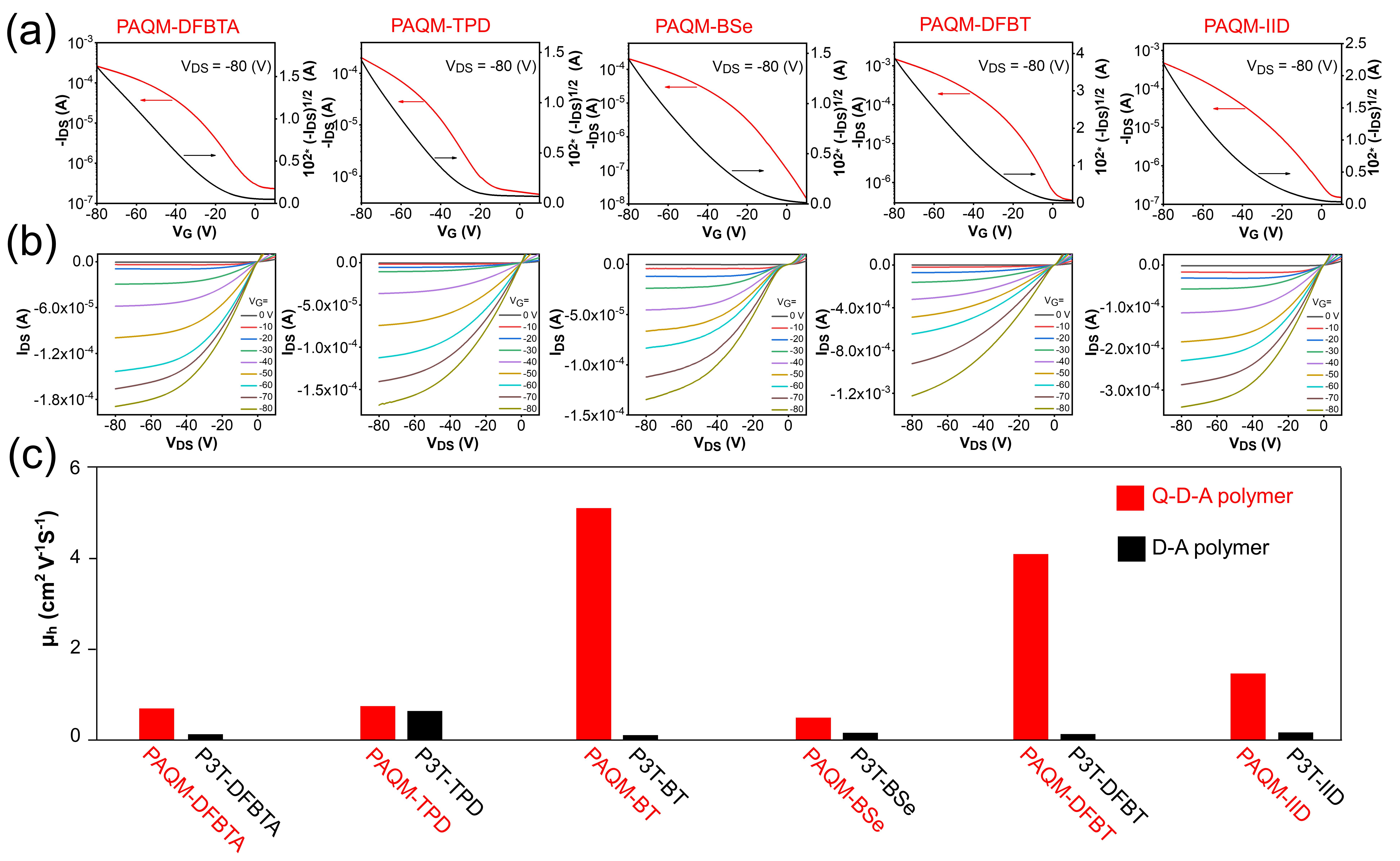 图3.Q-D-A聚合物的OFET器件在热退火后的a)转移特性曲线;b)输出特性曲线;c)Q-D-A聚合物与已报道的相应D-A聚合物空穴迁移率的对比。