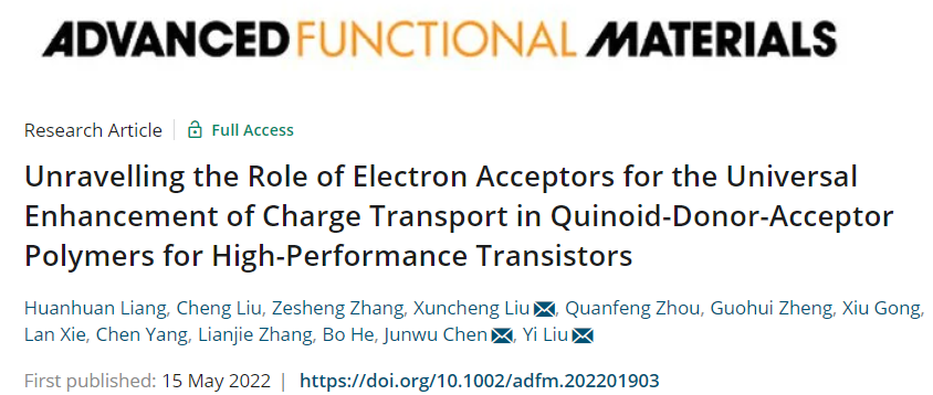 近日,公司刘迅成特聘教授团队的最新研究成果在国际顶级材料期刊《Advanced Functional Materials》(影响因子18.8,中科院一区TOP,2021年谷歌学术期刊“化学和材料科学”领域排名第九)上在线发表,这也是公司首次以英国上市公司365为第一完成单位在该期刊上发表论文,论文题目为“Unravelling the Role of Electron Acceptors for the Universal Enhancement of Charge Transport in Quinoid-Donor-Acceptor Polymers for High-Performance Transistors”,英国365公司官网硕士研究生梁欢欢、刘成和华南理工大学博士研究生张泽升为第一作者,英国365公司官网刘迅成特聘教授、华南理工大学陈军武教授和美国劳伦斯伯克利国家实验室刘毅高级研究员为通讯作者。