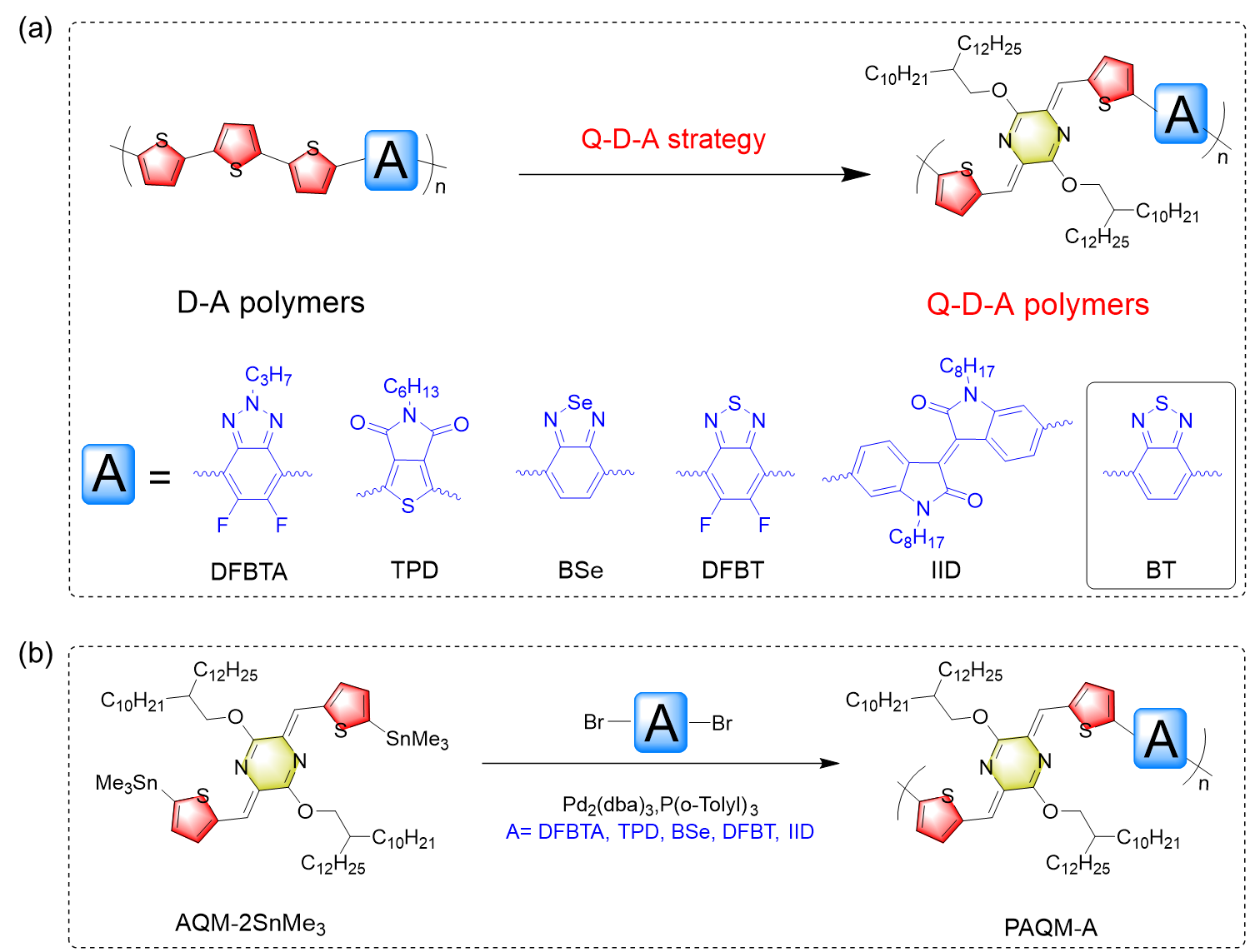 图1. a)本工作中报道的Q-D-A聚合物的分子结构和已报道的相应D-A聚合物的化学结构;b)本工作中Q-D-A聚合物的合成路线。