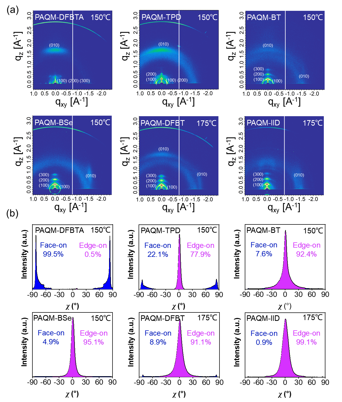图4. a) Q-D-A聚合物热退火薄膜的GIWAXS图;b)从Q-D-A聚合物热退火薄膜的(100)衍射峰中提取的极值谱图,峰面积在0 ≤ |χ| ≤ 45°和45 ≤ |χ| ≤ 90°的范围内分别对应于edge-on和face-on结晶。