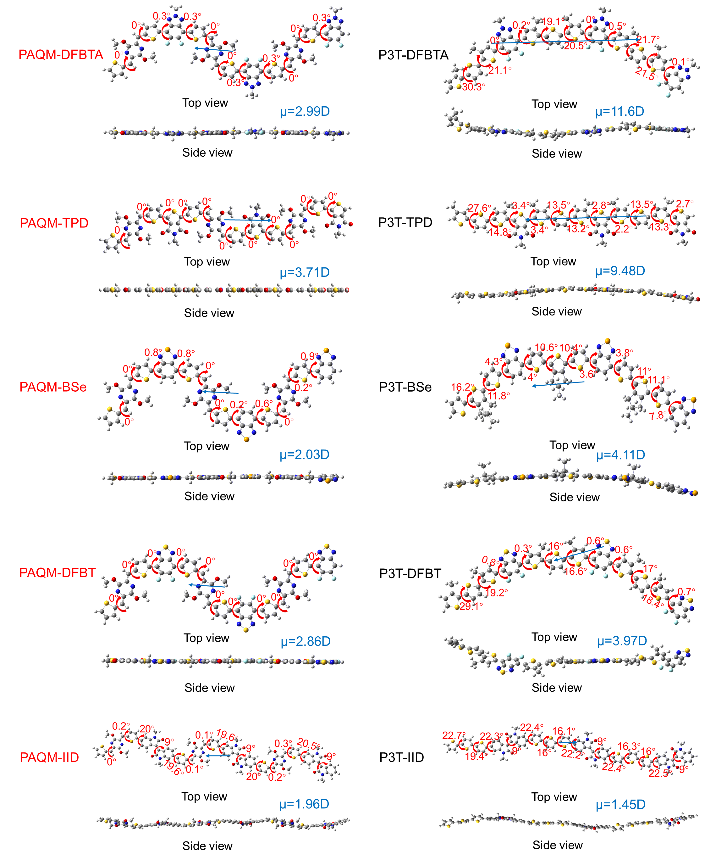 图2. Q-D-A聚合物和相应的D-A聚合物三聚体的最优几何构型和偶极矩。