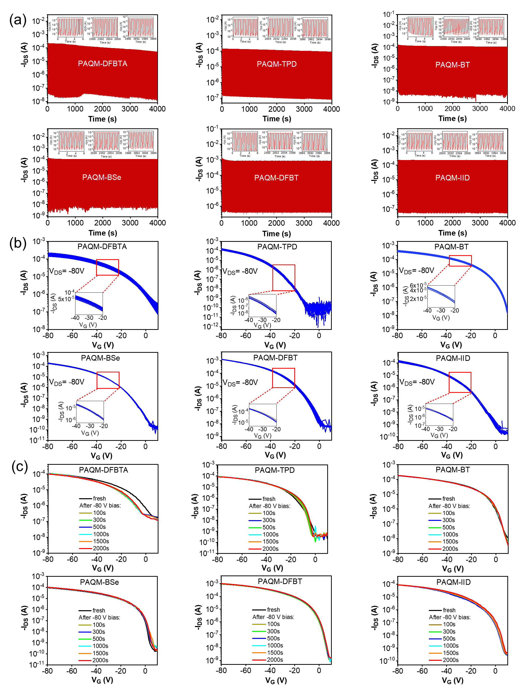 图5. a)Q-D-A聚合物的OFET器件开-关循环测试曲线,在VDS为−80 V时,施加−80 V和0 V的VG,循环9000次;b)Q-D-A聚合物的OFET器件转移特性曲线的重复性,VDS为−80 V,循环30次;c)Q-D-A聚合物的OFET器件偏压稳定性测试曲线,偏压为−80 V,持续时间2000 s。