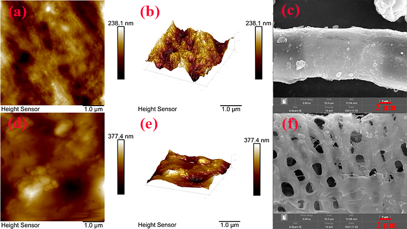 图2:(a),(b)和(c):原始玉米秸秆的AFM和SEM;(d),(e)和(f):[DBNH][Lev] 离子液体预处理玉米秸秆的AFM和SEM(140 ℃, 10% (w/w)玉米秸秆负载,6h)