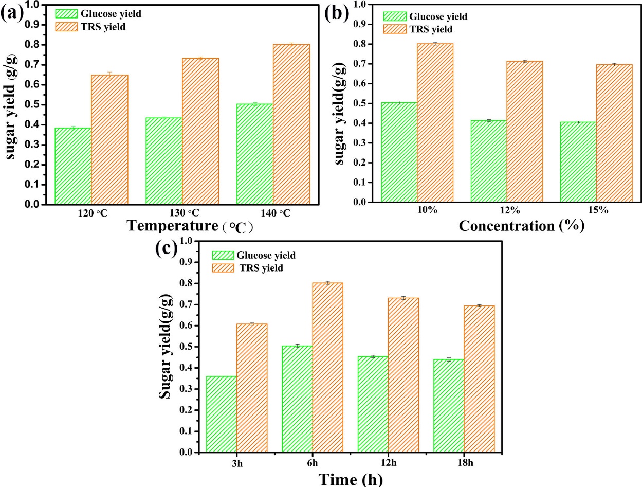 图4:预处理条件对TRS和葡萄糖产量的影响。(a):预处理温度对TRS和葡萄糖产率的影响;(b):玉米秸秆含量对TRS和葡萄糖产量的影响;(c):预处理时间对TRS和葡萄糖产量的影响