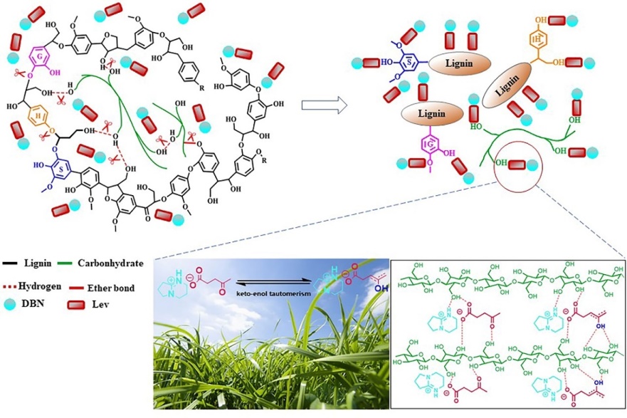 离子液体的优良溶解性一直是生物质预处理技术的研究热点,其本质就是破坏其木质纤维素内部氢键结构和剥离木质素。谢海波教授团队基于离子液体溶解木质纤维素机理的深入认识,利用生物基平台化合物乙酰丙酸(Lev)为原料和超强有机碱(DBN)简单混合制备生物基质子型离子液体([DBNH][lev]),并首次利用在木质纤维素(玉米秸秆)的预处理溶解和酶解制糖上,同时证实了在木质纤维素中也存在着[DBNH][lev]离子液体中的酮-烯醇互变结构参与溶解过程中的氢键相互作用(图1)。