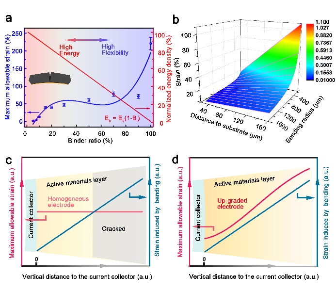 图1.力学梯度电极设计原理。a: 传统柔性电池因引入非活性组分导致能量密度与器件柔性存在矛盾;b: 电极弯曲状态产生的正应变与弯曲半径及位置相关;c: 均匀电极的力学性能与各部分存在的弯曲应变分布不匹配使得远离集流体一侧优先产生裂纹;d: 力学梯度电极的力学性能分布与弯曲应变相匹配从而提高本征耐弯曲性能。