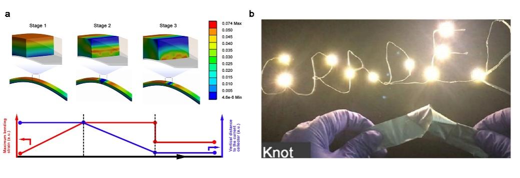 图2 a: 电极弯曲破裂过程应变分布有限元模拟;b: 基于力学梯度电极的软包电池展示