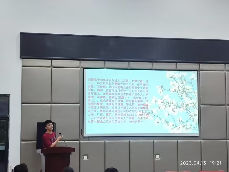 冶金2202的邓丁瑞同学分享的是《微笑总在装饰我的梦》,这是著名作家汪国真先生于2015出版的诗集。同时还给同学们分享了自己创作的两篇佳作: