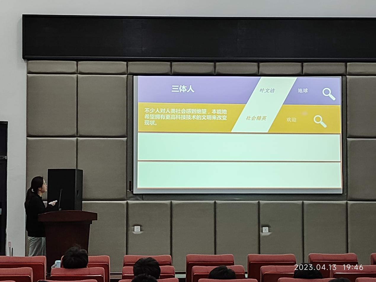材料2204的冯蓓蓓同学所分享的书目是刘慈欣的《三体》三部曲。作品主要讲述了地球人类文明和三体文明的信息交流、生死搏杀及两个文明在宇宙中的兴衰历程。这是一部包含哲理、人性、未来、灾难、科学于一体的史诗巨作。冯蓓蓓同学分享了书中具有深刻含义的句子,如:“给岁月以文明,而不是给文明以岁月”,宇宙就是一座黑暗森林,每个文明都是带枪的猎人,像幽灵般潜行于林间。在这片森林中,他人就是地狱,就是永恒的威胁,任何暴露自己存在的生命都将很快被消灭。这就是宇宙文明的图景,这就是对费米悖论的解释。每个读者都深刻记得这段对话,罗辑问到:“可是宇宙社会学的公理是什么呢?”