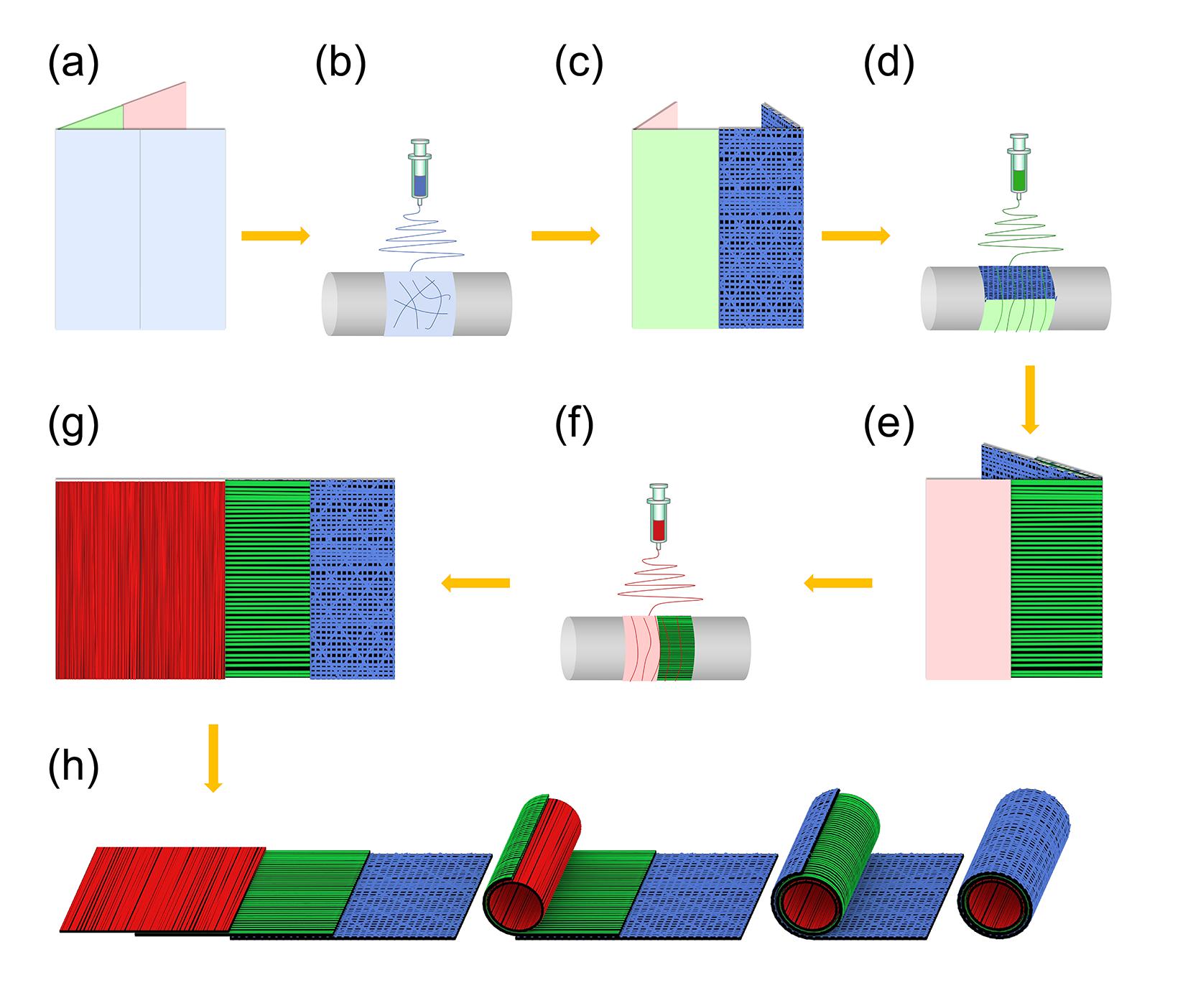 基于此,研究通过分步静电纺丝技术,按序制备一个随机取向的纤维层和两个定向排列的纤维层(2)结合折叠和滚动操作获得三层血管支架结果表明,三层血管支架具有很大的潜力,可以仿生天然血管三层结构并引导类似天然血管细胞的空间排列,从而进一步促进血管的全面重建和再生。