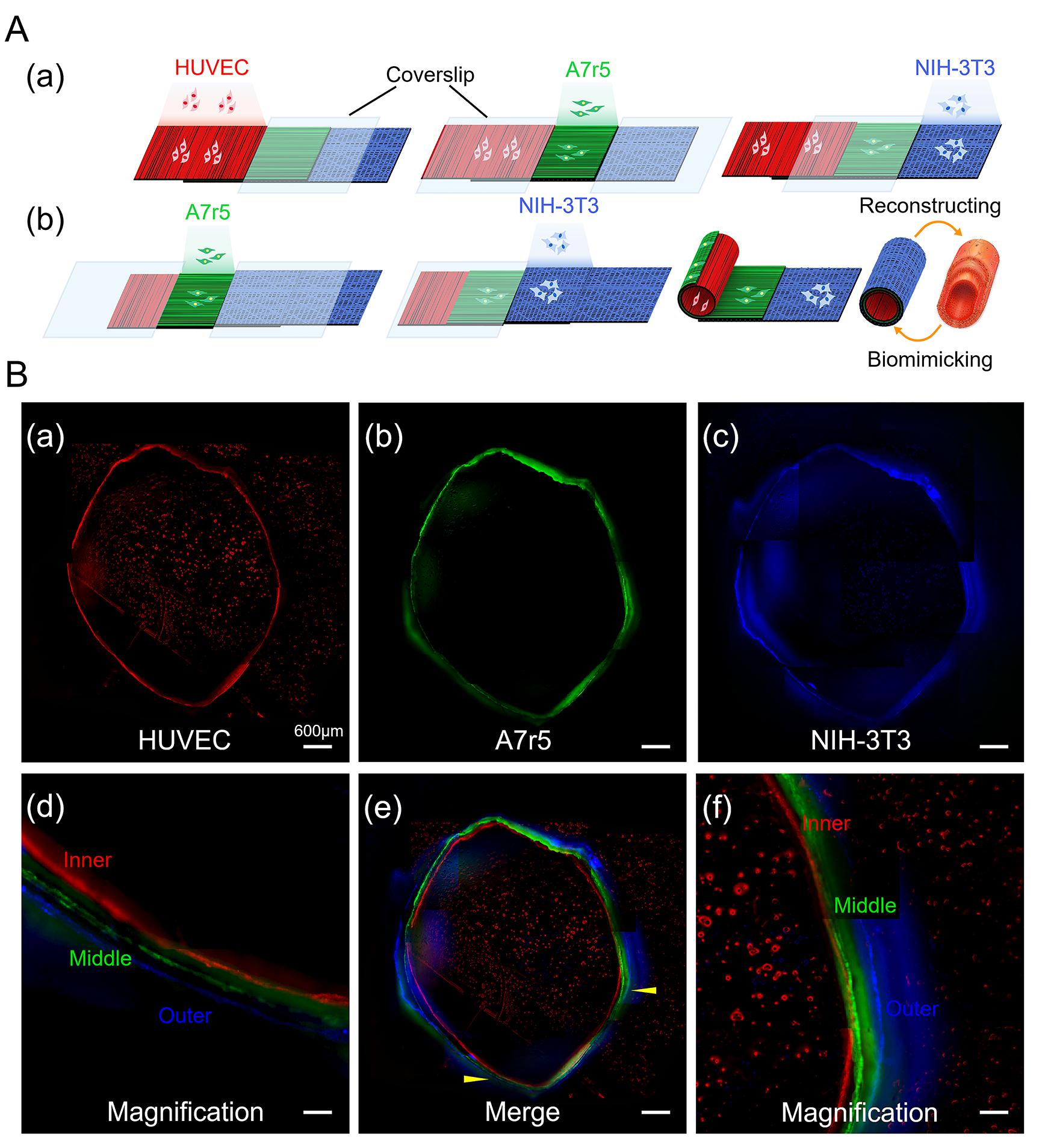 此外,利用该血管支架的特殊构建策略,同时接种不同的血管细胞,在细胞粘附后,只需滚动支架即可完成体外血管细胞和ECM的空间排列及三层结构的重建。荧光图像清晰地显示了血管细胞沿重建支架壁的内层到外层以三维形式有序分布(3)