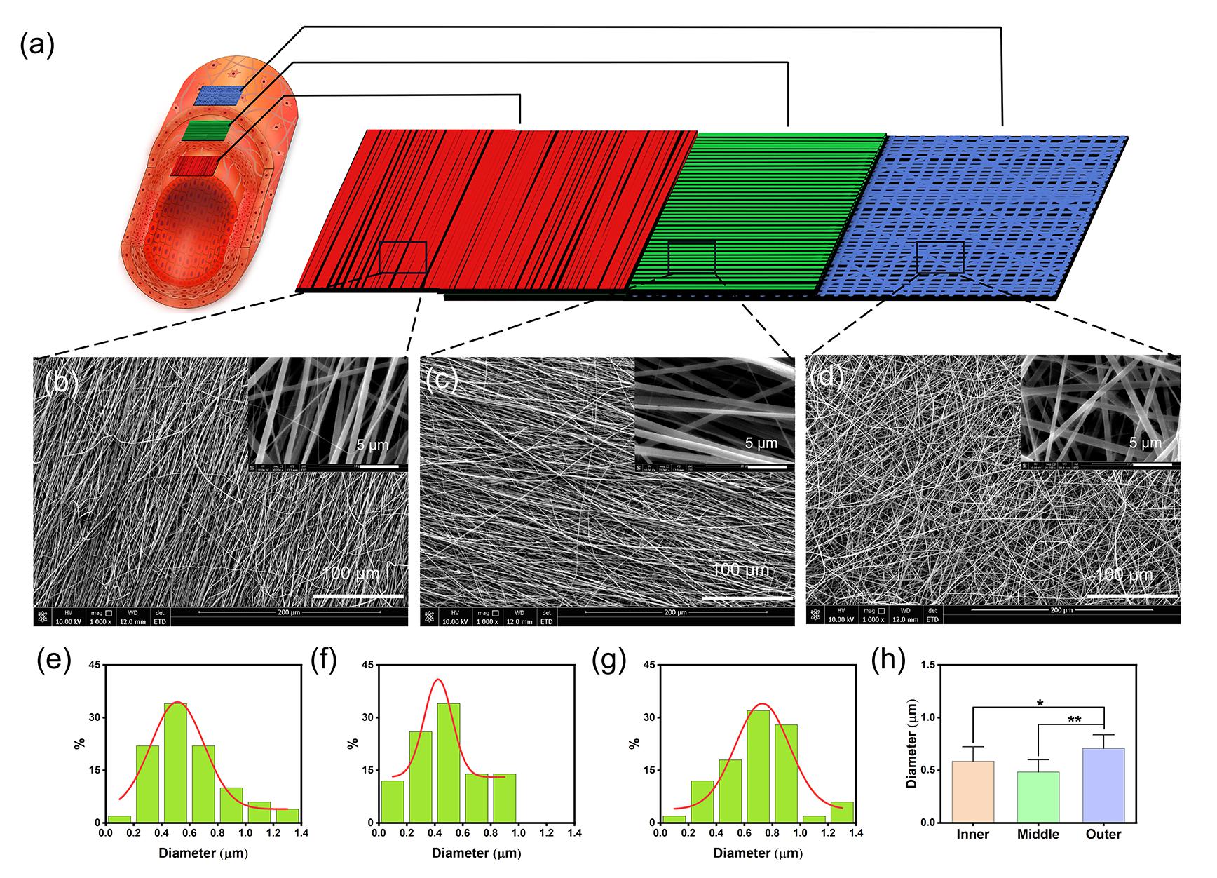心血管疾病是危及人类生命的高危疾病。因此,迫切需要有效的血管移植物作为自体移植物的理想替代品。天然血管是由细胞和细胞外基质组成的高度复杂的组织,具有独特的结构组织。细胞的空间排列和层结构对天然血管生理功能至关重要。然而,很难在一个支架中同时实现这两种特性的构建。目前大部分三层血管支架的制备过程复杂且不可控。