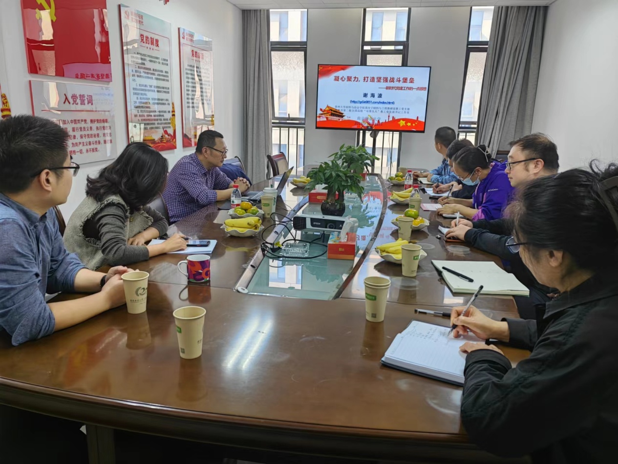 谢海波教授以“凝心聚力,打造坚强战斗堡垒”为主题,从“加强党建文化建设,发挥党建引领作用”;“落实党支部标准化规范化建设,充分发挥党组织在党员教育、管理、监督以及组织群众、宣传群众、凝聚群众、服务群众上的主体作用”;“多举措显著提升支部凝聚力,提高科技创新能力、人才培养质量,服务地方经济发展,破解人才引进难题”,三个层面分享了支部党建的路径和成效,着重介绍了支部党建工作与业务深度融合促进中心工作高质量发展的特色做法。与会代表就党建工作与中心业务工作的深度融合、工作室的申报与建立、党支部的建设、青年教师及员工党员的培养等内容进行了充分的探讨与交流。