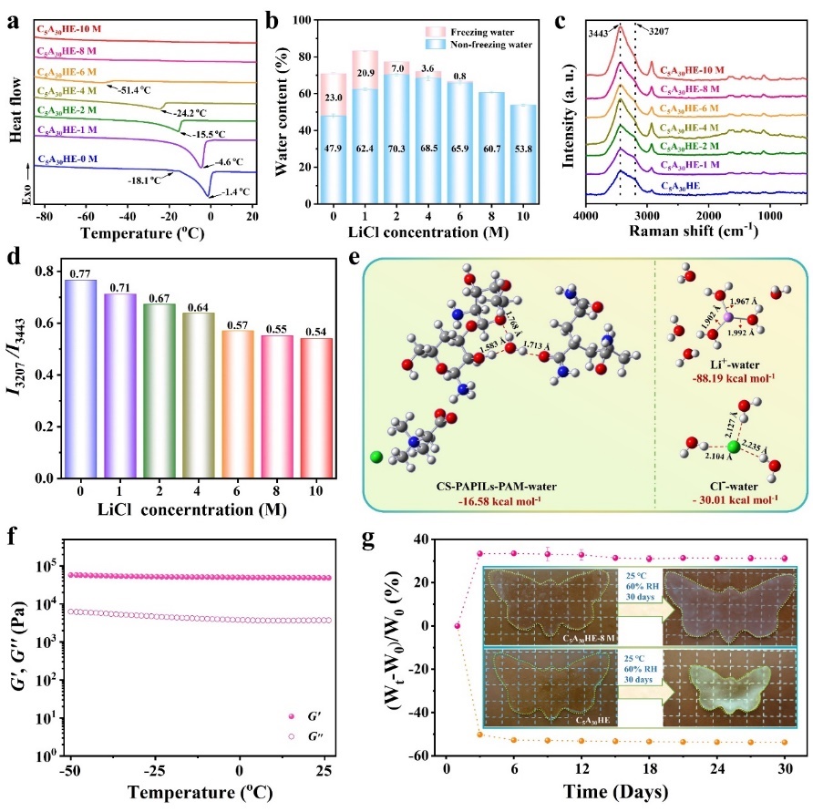此外,调节LiCl浓度也能有效调控CS-PAPILs/PAM/LiCl DN水凝胶的抗冻性能(图3)。从DSC可以看出LiCl浓度的增加使吸热峰移向更低温度,这源于Li+和水分子形成Li+ (H2O)n水化结构,使水凝胶中的自由水逐渐转变为非冻结水,这一现象也在拉曼测试、流变测试和DFT模拟得到了验证。此外该DN水凝胶也具有优异的保水能力。