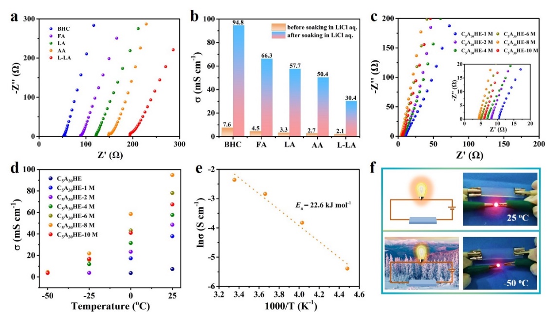 通过电化学工作站研究了水凝胶结构对离子电导率的影响(图4),通过壳聚糖和甜菜碱盐酸盐制备的水凝胶在未浸泡LiCl水溶液的情况下达到7.6 mS/cm的高离子电导率,高于醋酸、甲酸、乳酸、乙酰丙酸等条件下制备的水凝胶电解质,证明了壳聚糖基聚(非质子/质子离子液体)结构对水凝胶电导率的卓越性。在浸泡8 M的LiCl水溶液后,CS-PAPILs/PAM/LiCl双网络水凝胶的离子电导率升高至94.8 mS/cm,在-50℃仍能达到4.6 mS/cm,表明该水凝胶电解质具有优异的电导率和抗冻性能。