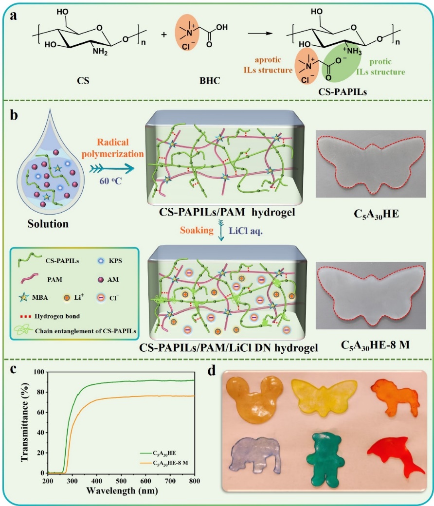 具有柔韧性和导电性的聚合物水凝胶电解质在柔性电子器件中得到了广泛研究和应用。然而,传统水凝胶电解质在零度以下的环境中容易发生冻结,其次,高含水量易使水凝胶电解质发生细菌滋生,极大地限制了其在便携式储能设备和柔性可穿戴设备领域的应用。另外,基于绿色可再生的天然高分子材料制备水凝胶电解质得到了研究人员的日益青睐。因此,开发多功能与环境友好的水凝胶电解质具有重要意义。