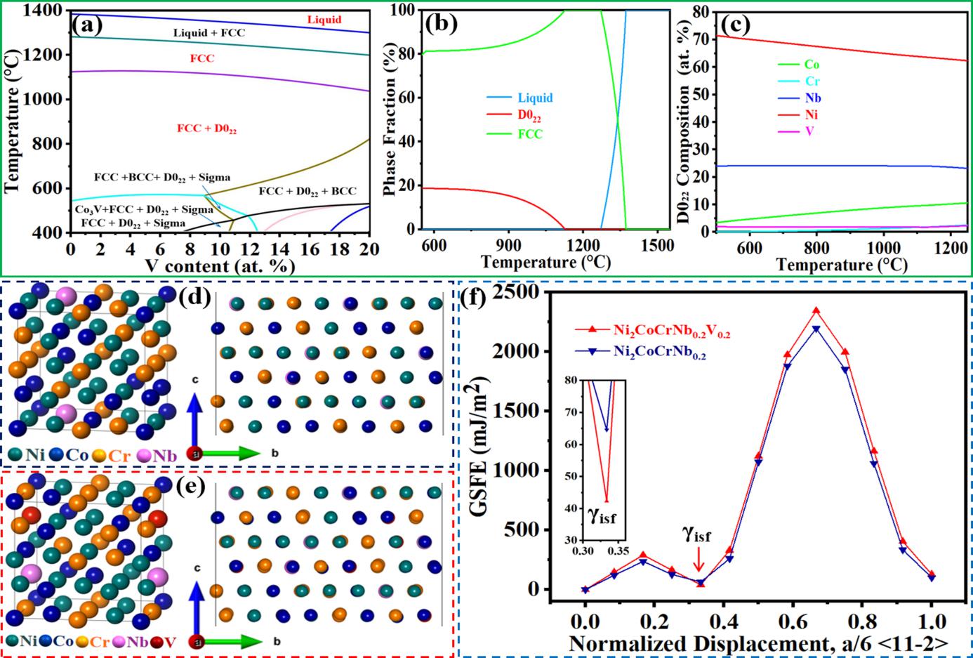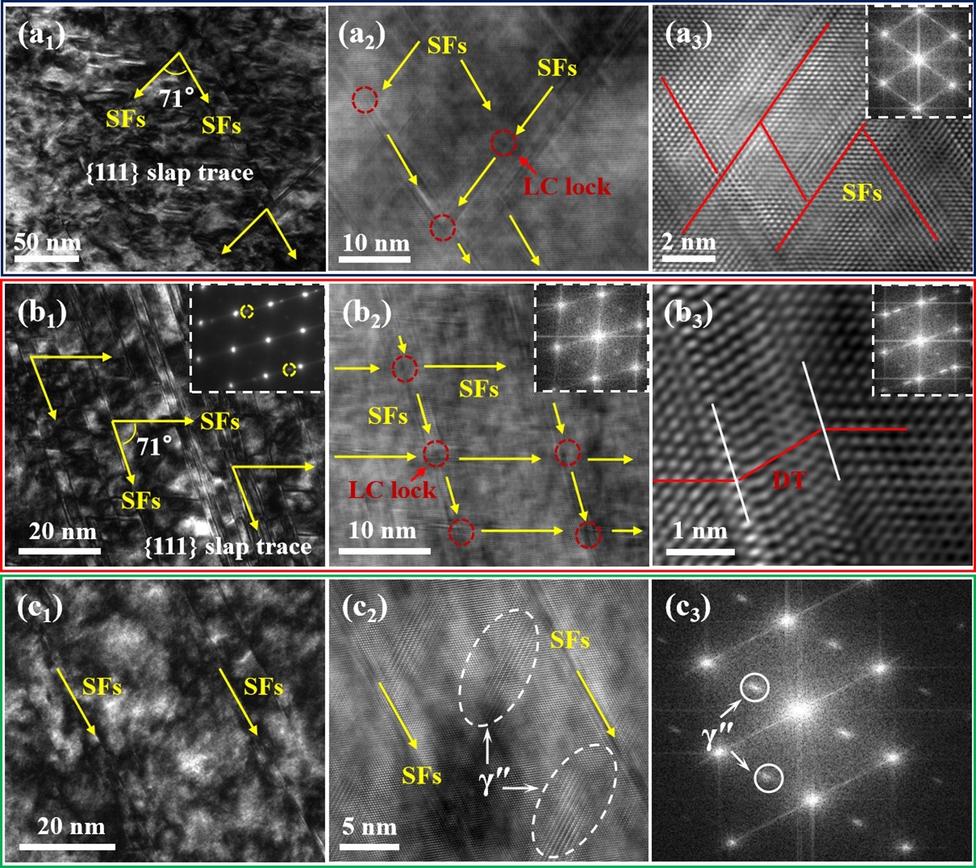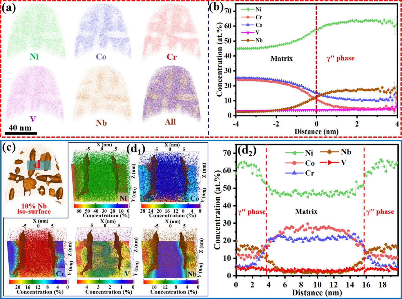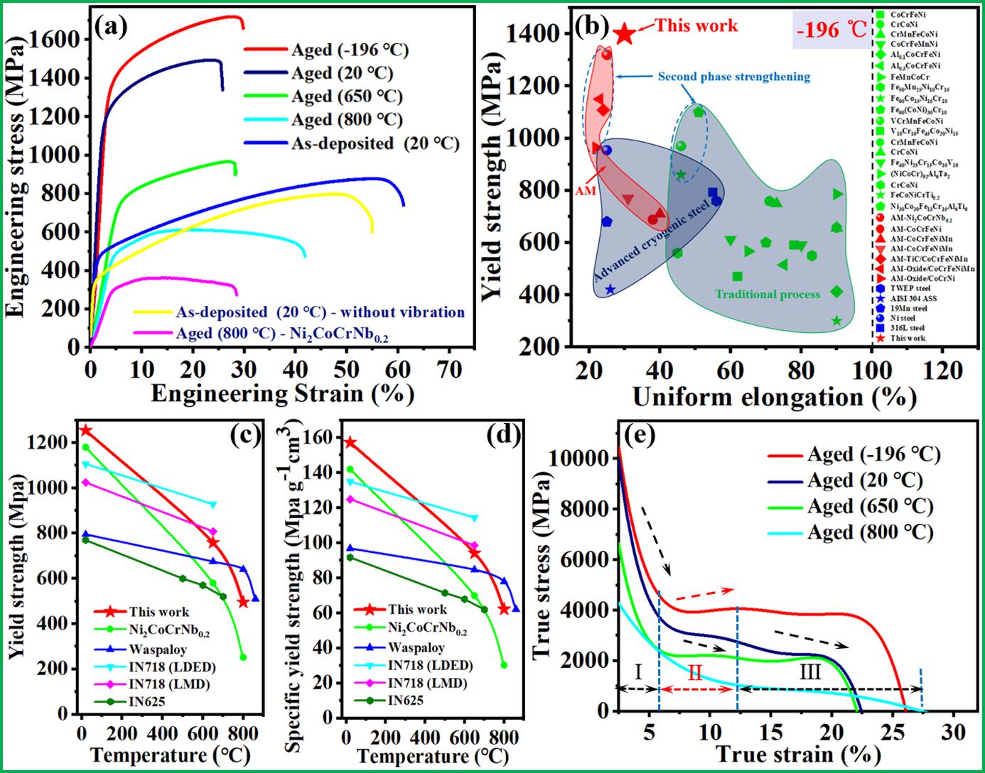 该团队通过第一性原理和相图模拟计算巧妙的设计出了Ni2CoCrNb0.2V0.2中熵合金,该合金在-196-800℃温度范围内具有超强力学性能。同时,在直接激光能量沉积制备工艺中引入了自主搭建的机械振动场,有效的降低了合金的孔洞、成分偏析和粗大的柱状晶。块状中熵合金经过适当的热处理后,在-196℃下屈服强度达到∼1398 MPa,极限强度达到∼1719MPa,拉伸伸长率为∼30%,在650℃下屈服强度达到∼751 MPa,极限强度达到∼967MPa,拉伸伸长率为∼28%,具有同类报道中最好的力学性能。团队通过SEM、EBSD、TEM和APT等先进分析手段,揭示了γ′′相在不同温度下的强化机理。该成果的提出,为开发宽温域合金材料提供了一条有效的路径,为实现我国在航空航天、探月工程和核聚变等领域材料的国产化起到积极的作用。