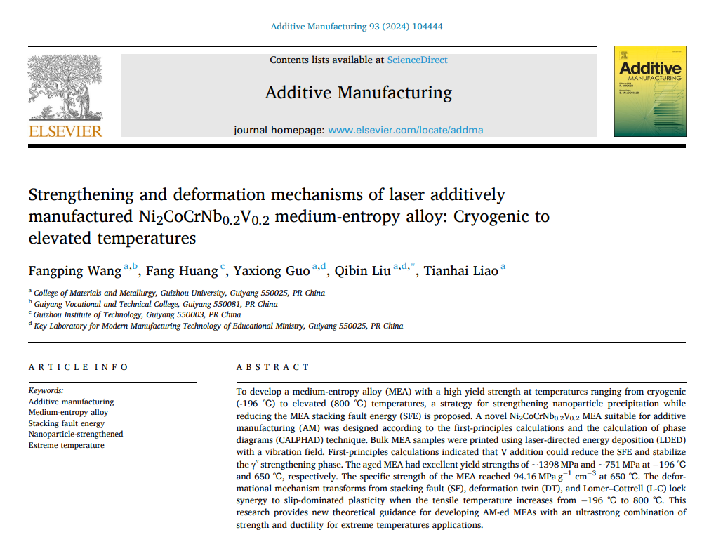 近日,刘其斌教授团队在增材制造顶刊《Additive Manufacturing》(IF=10.3)公开发表了题为“Strengthening and deformation mechanisms of laser additively manufactured Ni2CoCrNb0.2V0.2 medium-entropy alloy: Cryogenic to elevated temperatures”研究成果。该研究成果的第一作者是英国上市公司3652021级博士研究生王方平,通讯作者为刘其斌教授。同时,该工作得到了英国365公司官网郭亚雄特聘教授的指导。