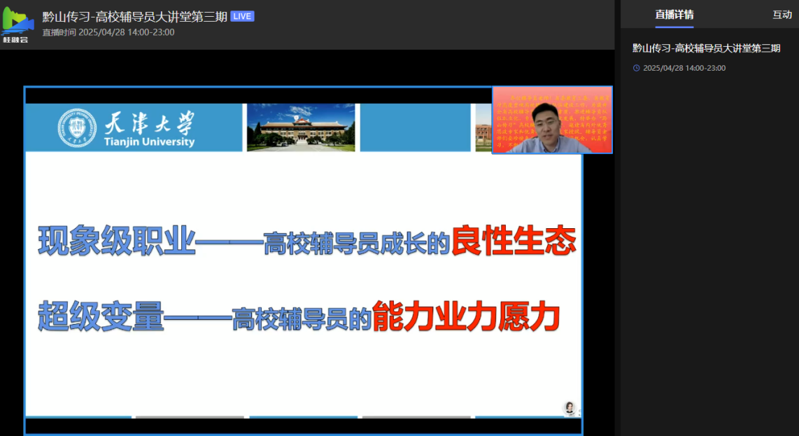 本期大讲堂吸引全省高校千余名辅导员在线观看。参会辅导员纷纷表示,两位专家的分享既有高屋建瓴的政策解读,又有切实可行的实践指导,特别是“三维路径破解职业瓶颈”“工作室培育机制”“五高特征认知升级”等内容极具实操性,为自身职业规划提供了清晰参照。