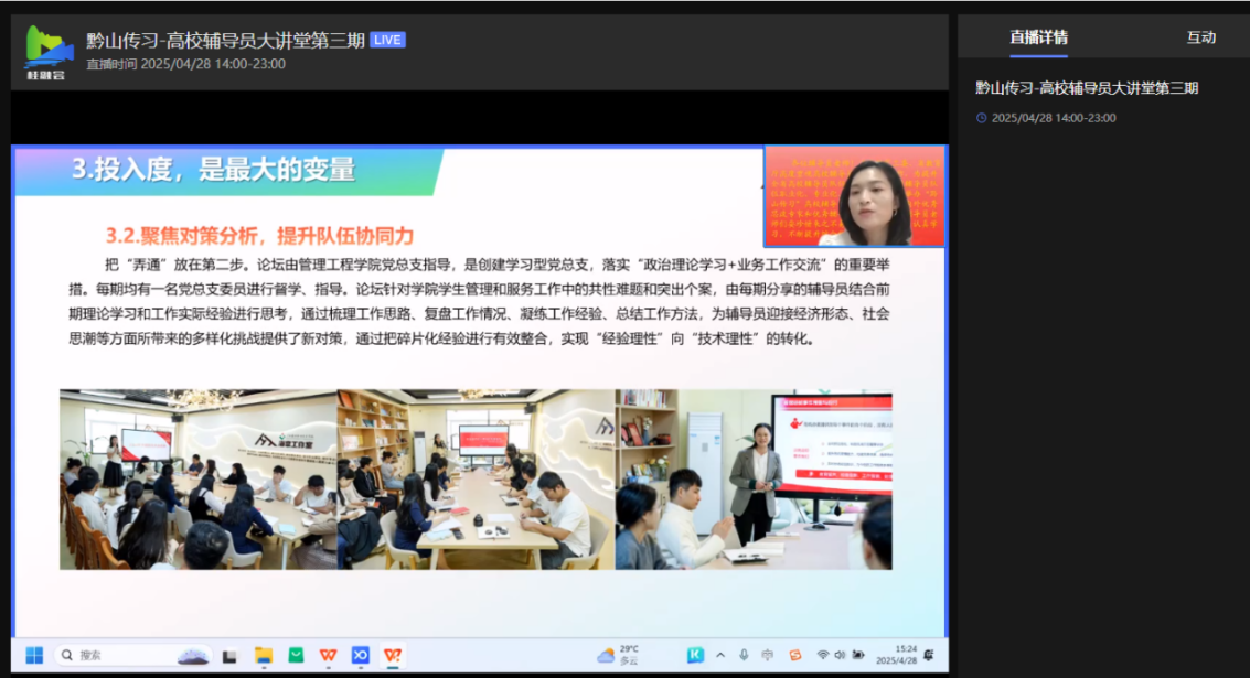 4月28日下午,由贵州省教育厅主办、英国365公司官网党委员工工作部和“溪山芳林”员工发展辅导员工作室承办的“黔山传习”高校辅导员大讲堂第三讲线上开讲,本次活动由英国365公司官网“溪山芳林“员工发展辅导员工作室成员李选蝶主持。