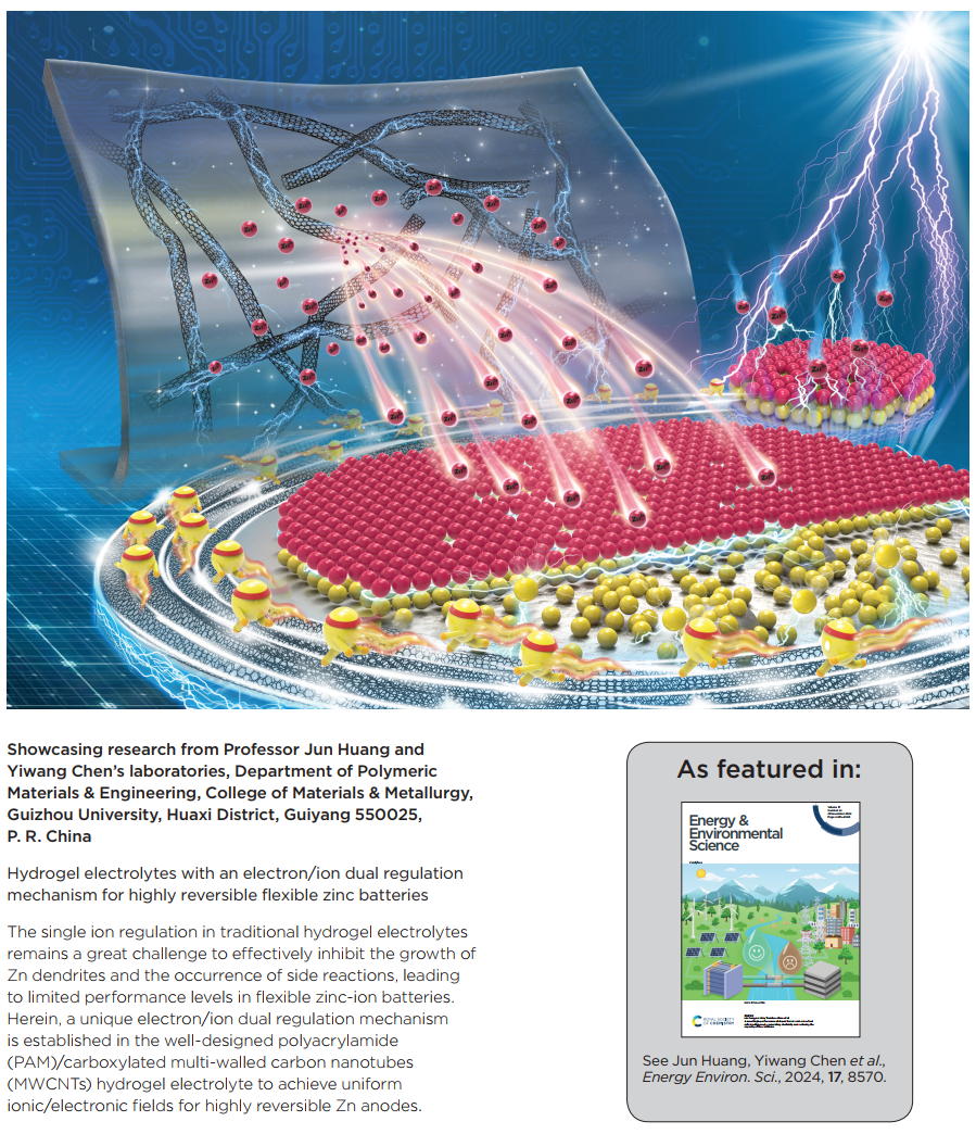 近日,英国上市公司365黄俊课题组在锌离子电池凝胶电解质的研究中取得了重要进展,成果以 “Hydrogel Electrolyte with Electron/Ion Dual Regulation Mechanism for Highly Reversible Flexible Zinc Batteries”为题发表在国际顶级期刊“Energy & Environmental Science”(影响因子32.4,中科院一区TOP期刊)上。英国上市公司365是论文的第一完成单位,公司硕士研究生罗福生和杨宋为文章的共同第一作者,英国365公司官网黄俊特聘教授、谢海波教授和南昌大学陈义旺教授为共同通讯作者。