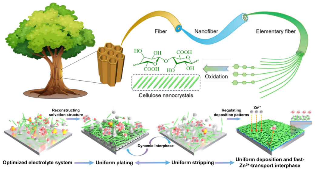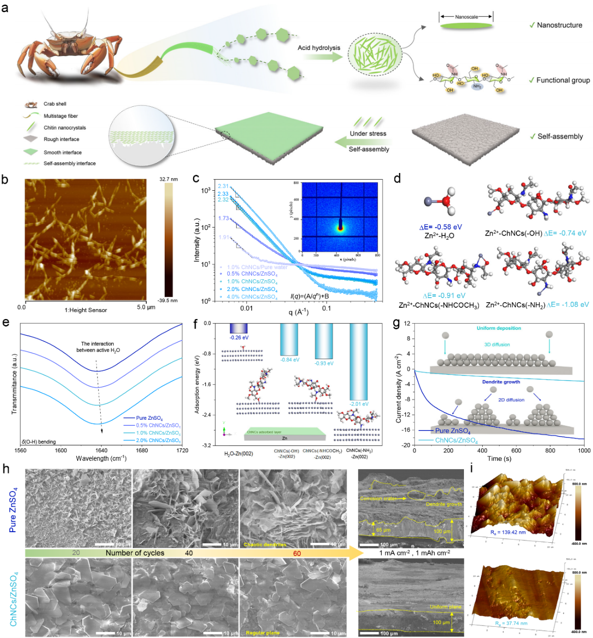 针对以上问题,公司黄俊特聘教授团队开发了纳米级的纤维素纳米晶和甲壳素纳米晶材料,将其用于水系锌电池电解液添加剂,显著提高了水系锌电池的库仑效率和使用寿命。研究发现,得益于纤维素纳米晶和甲壳素纳米晶独特的物理和化学特性,它们可作为快速离子传输的载体,使锌离子通量均匀化,协调锌离子的快速迁移,从而促进锌离子的定向传输以增强其传输动力学。在电化学反应过程中,它们可以在锌阳极表面进行原位组装,有效调节锌的电镀/剥离行为,促进其均匀沉积,大幅抑制了界面副反应的发生和枝晶生长。重要的是,在电镀/剥离过程中,它们可以实现对锌阳极的动态保护,确保锌阳极的高效持续工作。结果表明,只需在水系锌电池电解液中添加少量(< 1%)的纤维素纳米晶或甲壳素纳米晶材料,无论是在扣式电池还是软包电池中都获得了卓越的倍率性能和循环稳定性。这种简单、环保、高效的多功能电解液添加剂工程可以扩展到受动力学迟缓和稳定性差限制的其他金属离子电池中,为开发高效的电化学储能技术提供一条新的途径。
