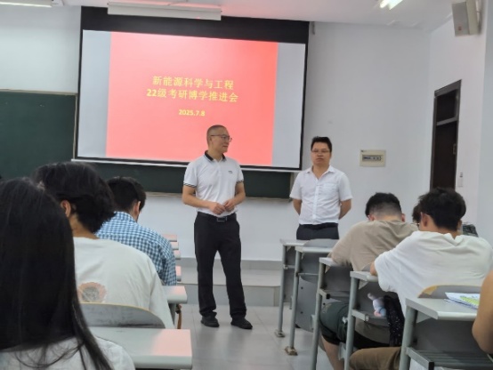 为提升员工考研备考质量,新能源科学与工程教研室于2025年7月8日下午在西楼114D教室组织召开了2022级本科生博学计划推进会。副经理陈朝轶教授、教研室主任戴新义教授、副主任王文豪老师、能科2202班班主任谷肄静老师参会。