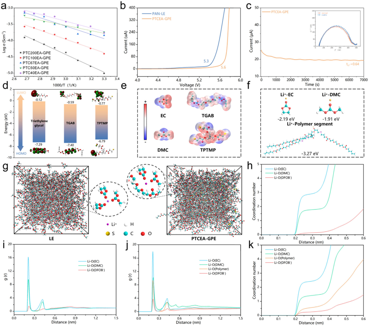 图2 PTCEA-GPE的电化学特性表征及锂离子在电解质中的配位环境