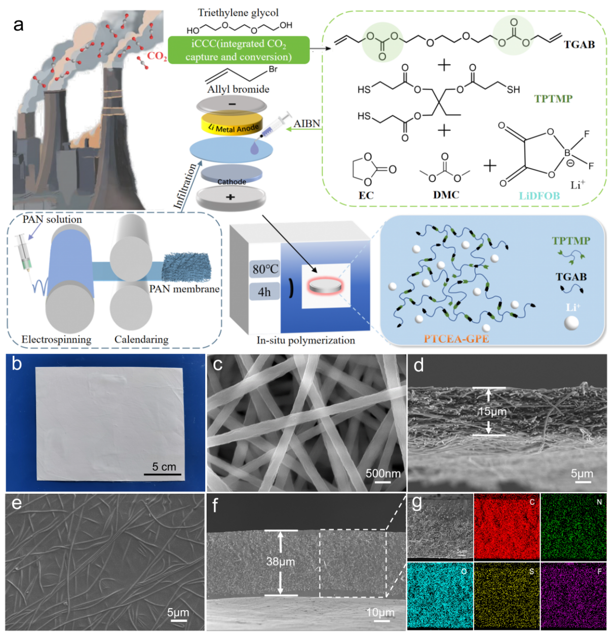 在该工作中,提出原位CO2捕获与转化理念,设计合成可聚合TGAB单体并开发先进凝胶电解质(PTCEA-GPE)。PTCEA-GPE通过分子工程整合-C-O-C-、-C-C-S-和-O-C(=O)-O-片段,实现高离子电导率、宽电化学窗口及高离子迁移数。原位聚合确保电极完全浸润,降低界面阻抗,促进均匀锂沉积与稳定SEI形成,同时静电纺PAN基质增强热稳定性。软包电池长循环与钉刺测试验证PTCEA-GPE的高稳定性和安全性。该研究为同时解决下一代锂金属电池高温稳定性和高压兼容性等关键挑战提供了重要见解。