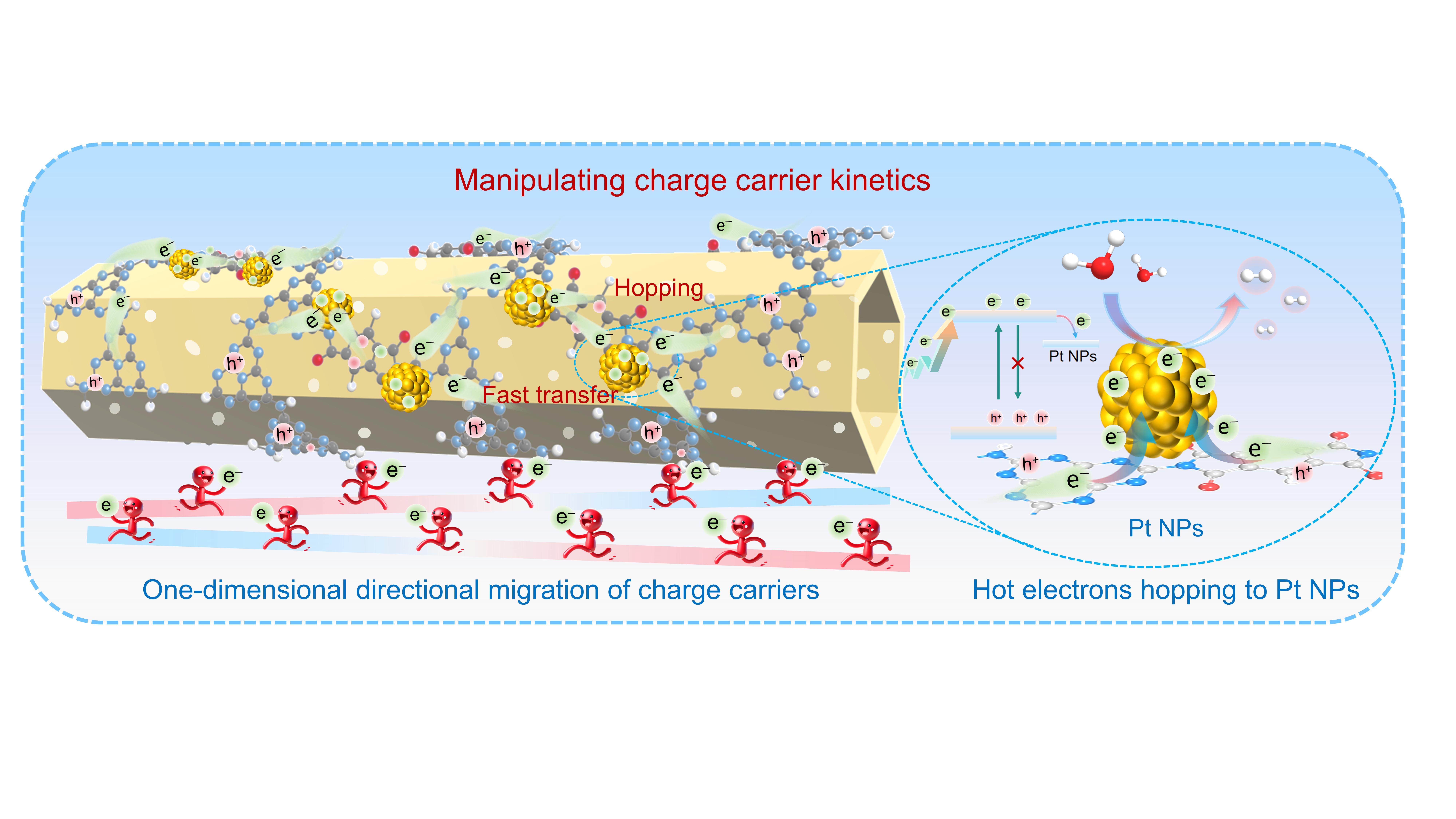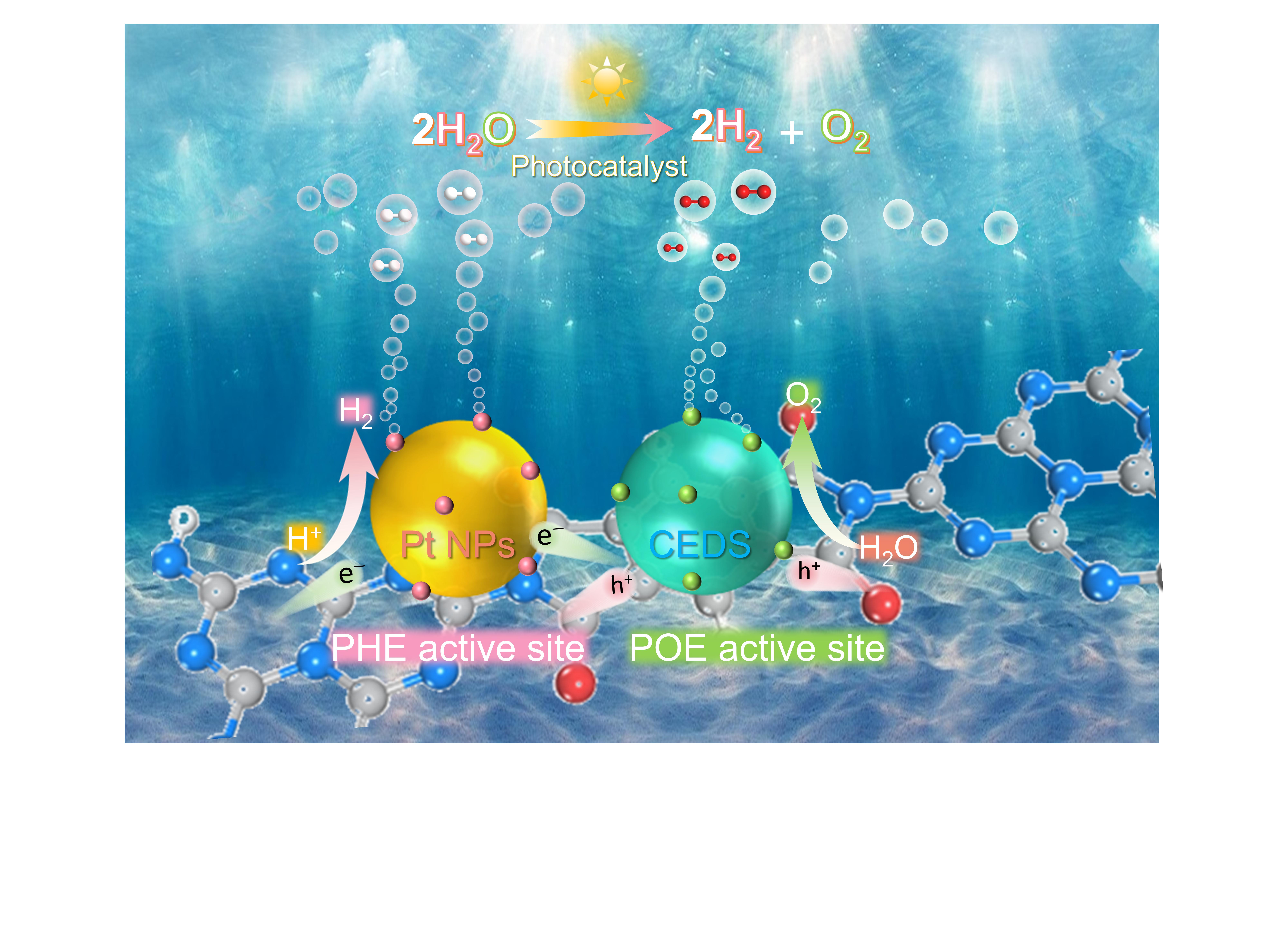 鉴于此,研究团队设计了一种串联加速热电子转移策略,来调谐载流子动力学与表面反应动力学的匹配度。通过在大π共轭中空管状g-C3N4框架上嵌入共轭缺电子结构(CEDS),来诱导Pt纳米颗粒(Pt NPs)定向锚定。实验观察表明,CEDS和Pt NPs协同加速了光生电子的快速分离和转移,从而延长了光生空穴的有效寿命。机理研究证实了CEDS作为水氧化的活性位点加快了表面反应动力学。因此,实现了可见光下优异的光催化全解水性能,最高的H2和O2产率分别为1328.65和631.33 mol g1 h 1,在400 nm处的AQY为4.2%。本研究为合理设计可见光响应的有机光催化剂以平衡载流子动力学和表面反应动力学提供了一条有效的途径。